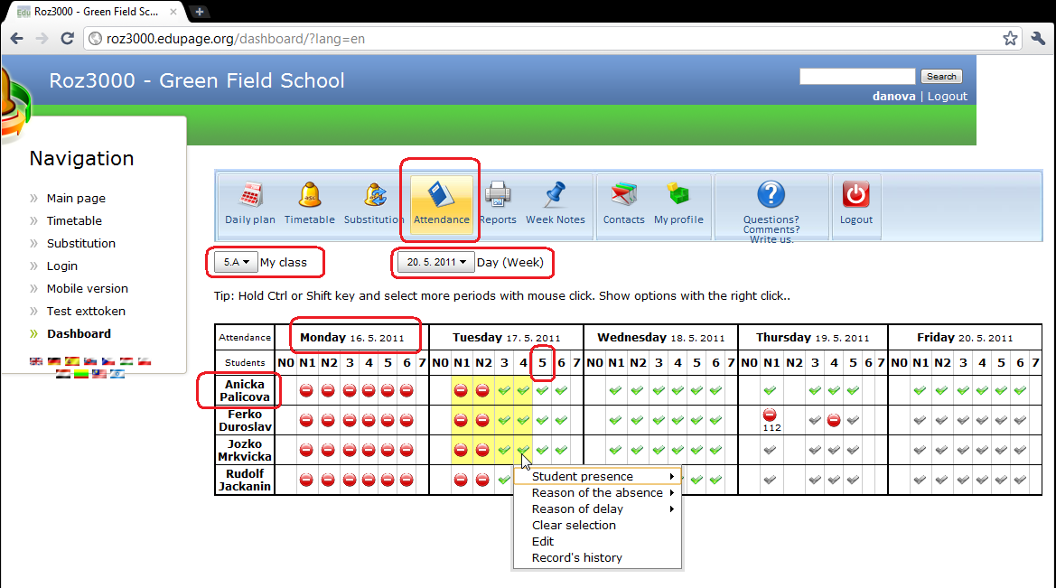 We have created section for simply administration the student's attendance. It's possible for the class teacher / administrator. You can acces this section by logging in the system an chooseing Attendance from the upper menu bar.
