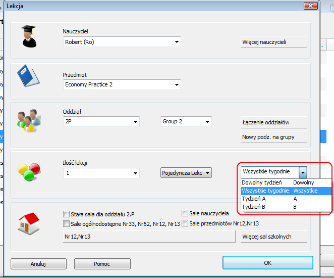 Pierwsze rozwiązanie zalecane jest w sytuacji, kiedy większość lekcji mamy regularnie co tydzień, a tylko kilka w cyklach. Lekcje te mogą występować na tej samej pozycji w odpowienich tygodniach.