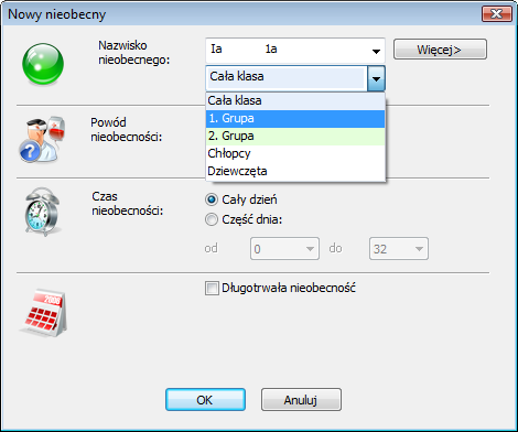 W oknie poniżej klasy można wybrać, czy cała klasa jest nieobecna czy tylko grupa.