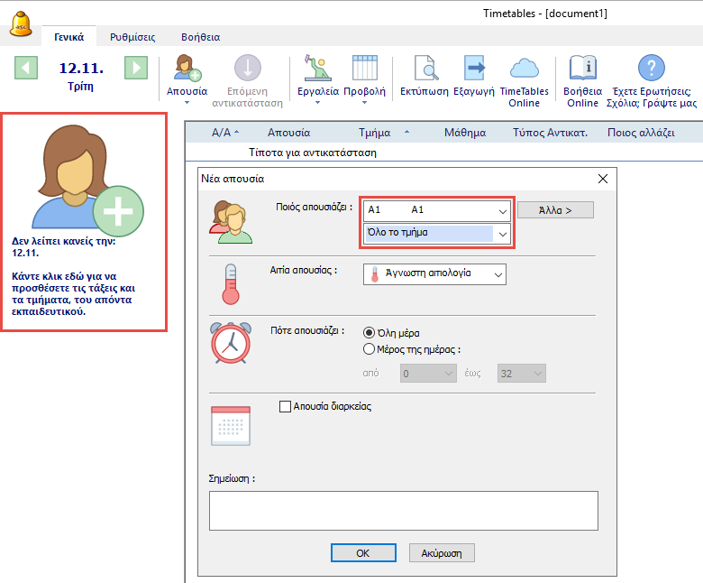 Μπορείτε να ορίσετε ότι ένα τμήμα θα απουσιάσει, με τον ίδιο τρόπο που ορίζετε και τις απουσίες των εκπαιδευτικών.