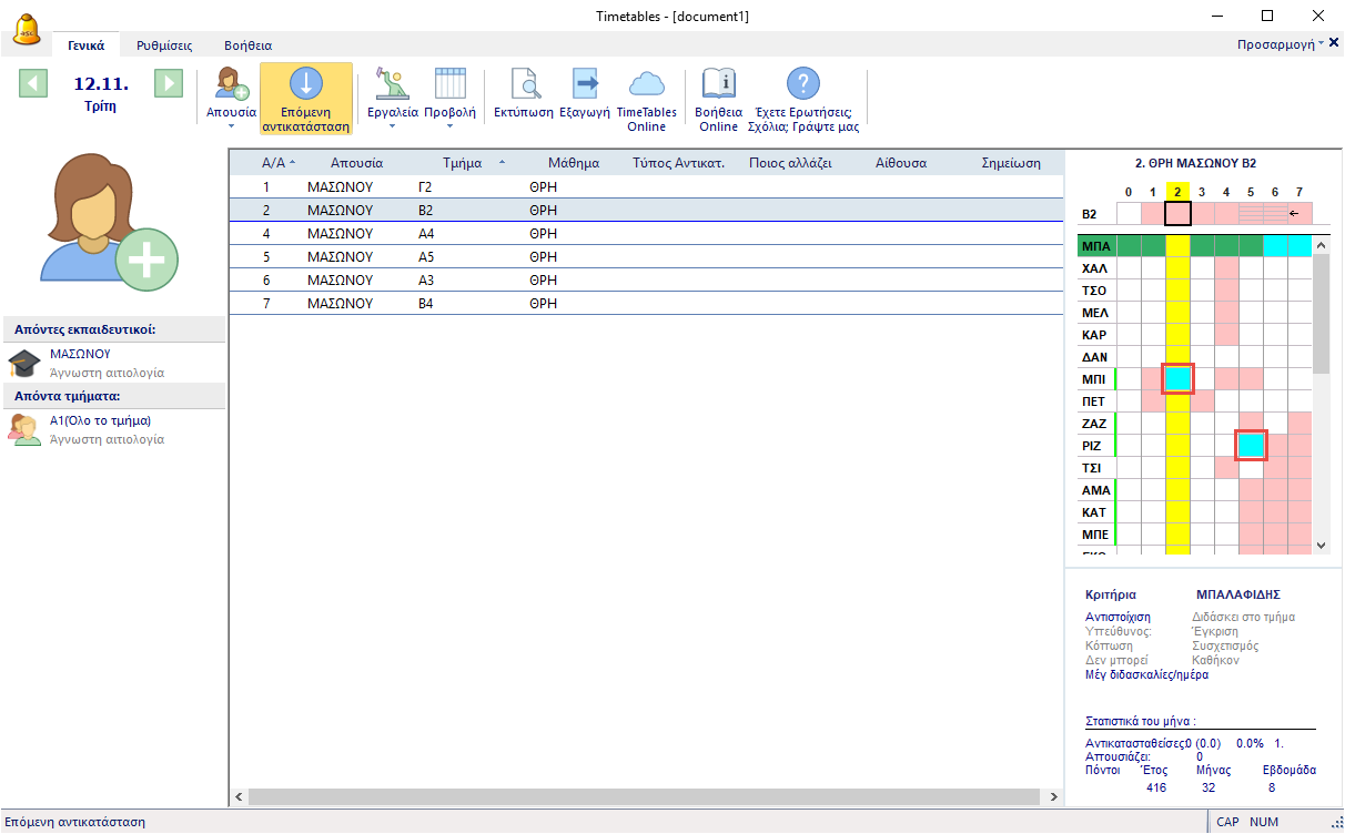 Αργότερα, όταν θα κάνετε την αντικατάσταση, η εφαρμογή θα εμφανίζει σαν ελεύθερους τους εκπαιδευτικούς εκείνους που είχαν διδασκαλίες στο τμήμα που απουσιάζει.