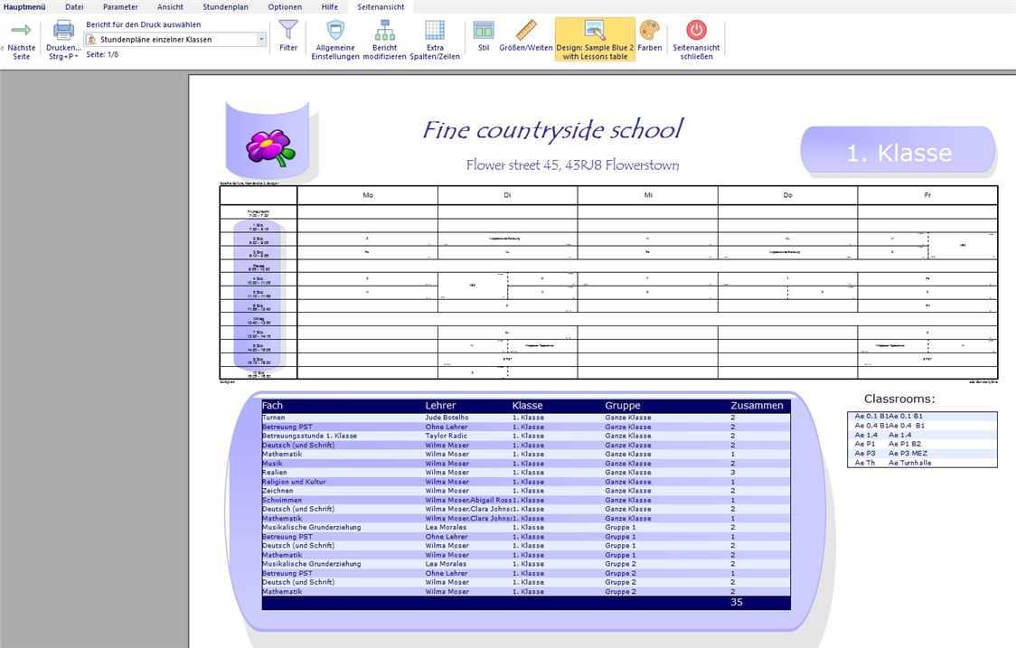 Sie können sich Ihr eigenes Design neu erstellen - mit Ihrem Schullogo, veränderten Fuß- und Kopfzeieln und weiteren Informationen ergänzen, die Sie brauchen können. Layout und Design in der Seitenansicht Ihres Stundenplans anpassen