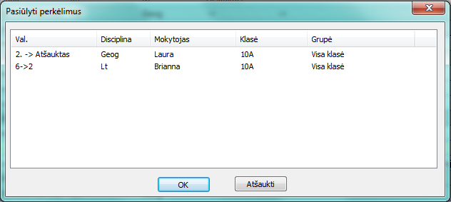 Atsivers toks langas. Programa pasiūlys atšaukti 2-rą pamoką ir perkelti 6-tą pamoką į jos vietą.