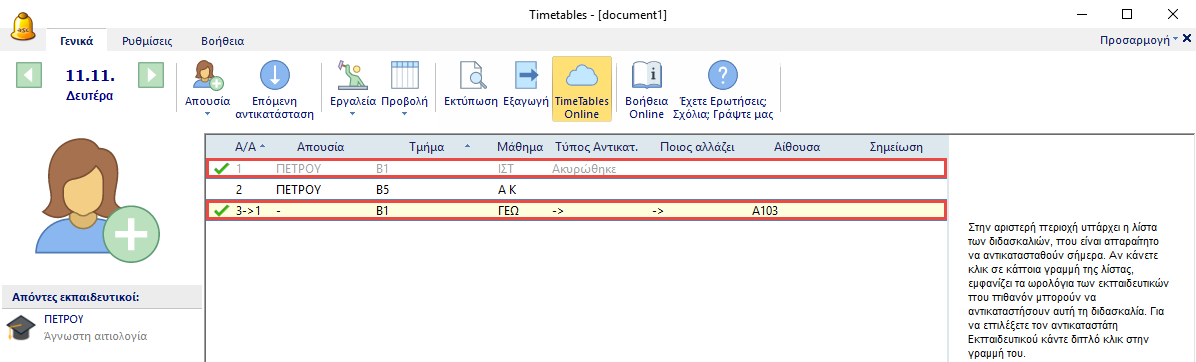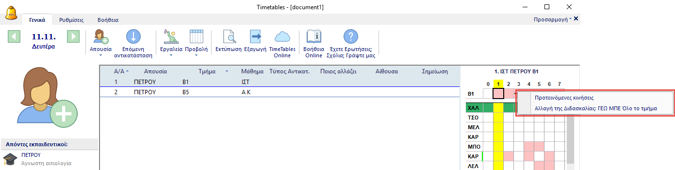 Μπορείτε να αγνοήσετε την πρόταση της εφαρμογής και να ορίσετε όποιον εκπαιδευτικό θέλετε για την αντικατάσταση της 2ης διδασκαλίας.
