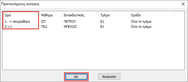 Εμφανίζεται η παρακάτω οθόνη και μπορείτε να δείτε ότι εφαρμογή προτείνει να ακυρώσετε την 2η διδασκαλία και στην θέση της να γίνει η 6η.