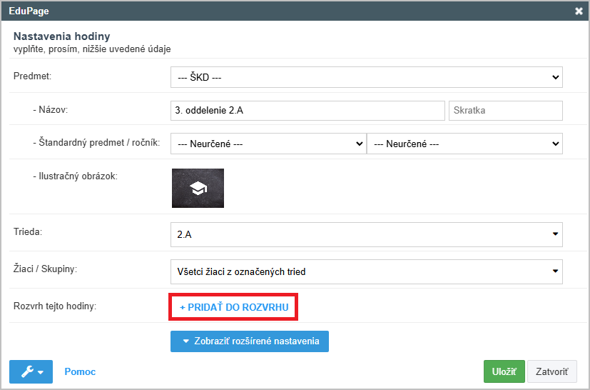 Pridať termín ŠKD do osobného rozvrhu môžete hneď pri vytváraní hodiny, alebo aj neskôr takto: