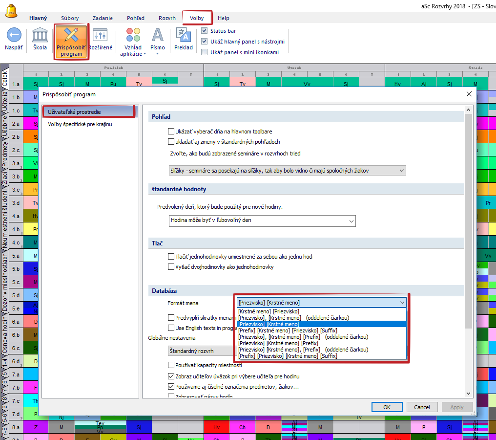 Aby ste túto situáciu napravili, musíte v programe aSc Rozvrhy správne nakonfigurovať formát mena. Urobíte tak v menu - Voľby - Prispôsobiť program - Užívateľské prostredie - Databáza - Formát mena.