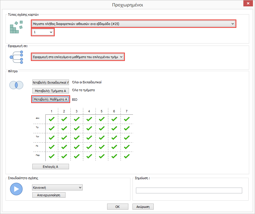 Ας πούμε ότι το τμήμα Α1 έχει Βιολογία 3 φορές την εβδομάδα. Η διδασκαλία της Βιολογίας μπορεί να είναι στις αίθουσες Α101, Α102, Α103 και το πρόγραμμα μπορεί να επιλέξει μόνο μία, αλλά πρέπει να είναι η ίδια και για τις 3 διδασκαλίες.