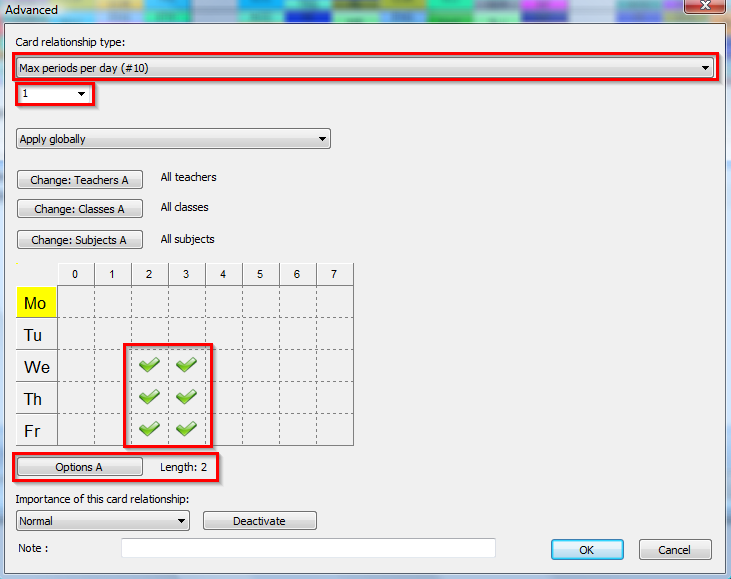 However in some cases you need more precise specification. Using this cardrelationship you can precisely define which subjects, what days, lessons etc: