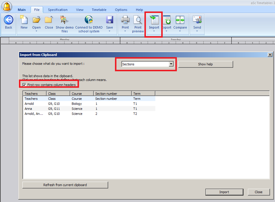2. Open timetables and create a new documnent. Then go to File/Import/Import from clipboard.