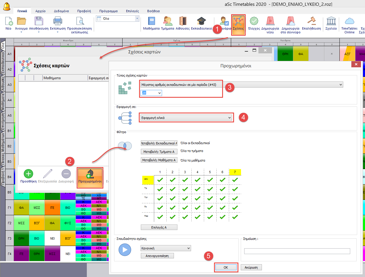 - Εάν χρησιμοποιείτε σχέσεις που ξεκινούν με “Μέγιστος αριθμός καρτών” ή με “Μέγιστος αριθμός περιόδων” υπάρχει περίπτωση να μην λειτουργήσουν σωστά ένα έχετε σπαστές διδασκαλίες ενωμένες σε μία κάρτα. ”Μέγιστος αριθμός εκπαιδευτικών” μετράει σωστά τον αριθμό εκπαιδευτικών χωρίς να επηρεάζεται από τις σπαστές διδασκαλίες.