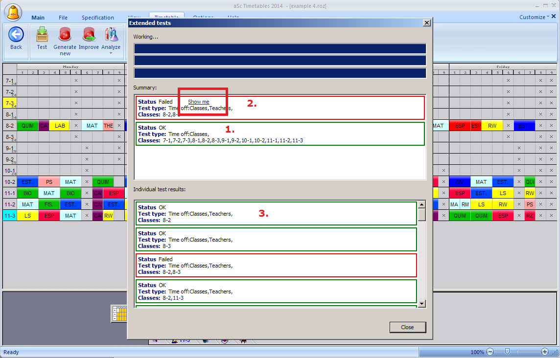 След това съфтуерът е добавил Неподходящо време за учители. Това тестване не е било успешно. Затова софтуерът се е опитал да премахне класовете един пo един, за да намери по-малка част от разписанието, която все още не може да бъде генерирана, отчитайки само Неподходящи времена за учители и класове.