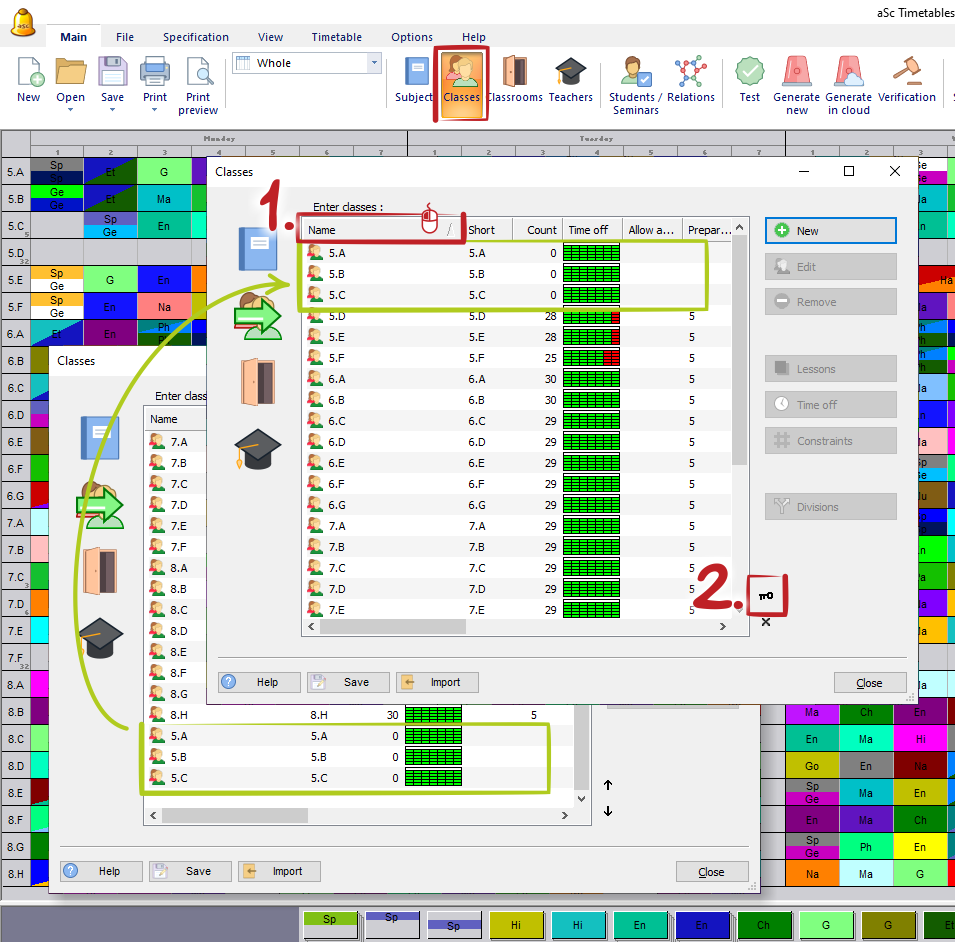 Just click on the item you wish to reposition in the list and use the up/down arrows to move it to the desired position. For classes, teachers, and classrooms, this will also change the order of timetable rows on the main screen in Whole/Teachers/Classrooms views.