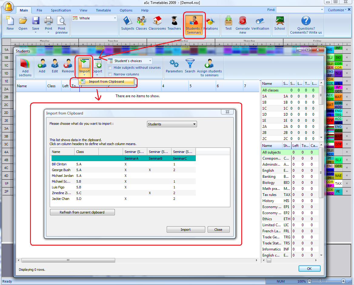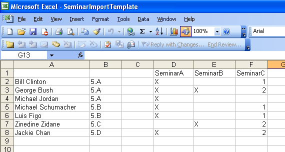 במקום להזין באופן ידני את התלמידים, אפשר לייבא את התלמידים ואת בחירות הסמינר שלהם מתוכנית MS Excel. רק בחר את הנתונים מגליון ה Excel שלך והלהעתק אותם אל לוח הגזירים (clipboard).