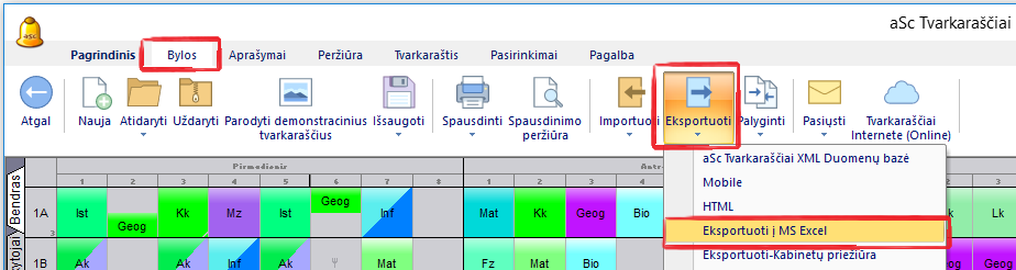 Eksportuoti tvarkaraštį galite, pasirinkę komandas "Bylos, Eksportuoti, Eksportuoti į MS Excel".