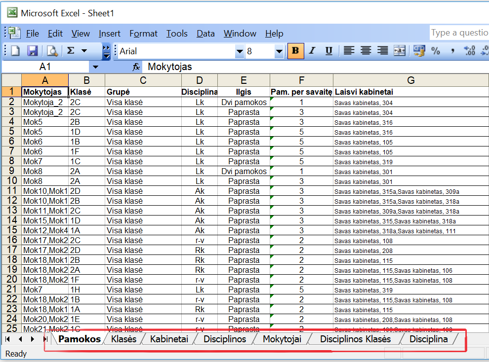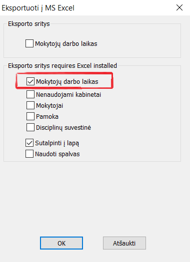 Labai naudinga būtų eksportuoti mokytojų darbo laiką. Tvarkaraščio duomenys (disciplinos, mokytojai, klasės, kt.) bus eksportuoti į keliolika Excel programos lentelių (lapų):