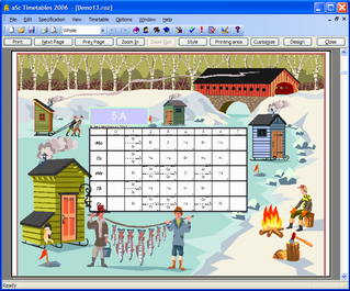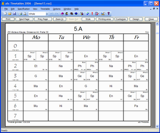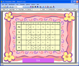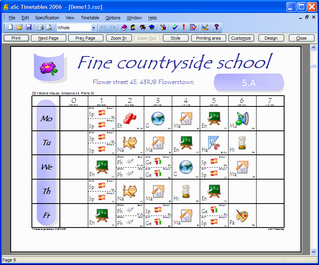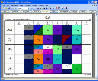 aSc TimeTables comes with a collection of predefined designs. You can choose and use one of them. You can also modify any design and create your own, customized for your school with your school's logo, address headers and all the information you might need on the printouts because your education ministery requires it.