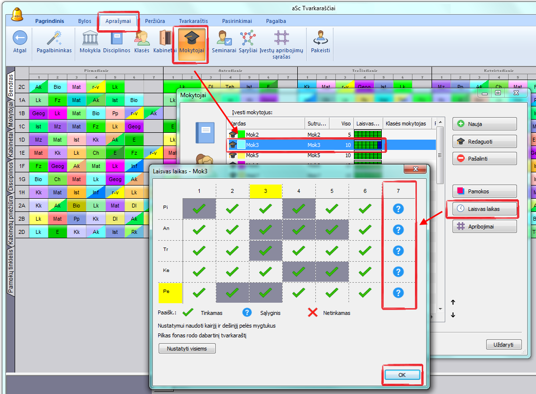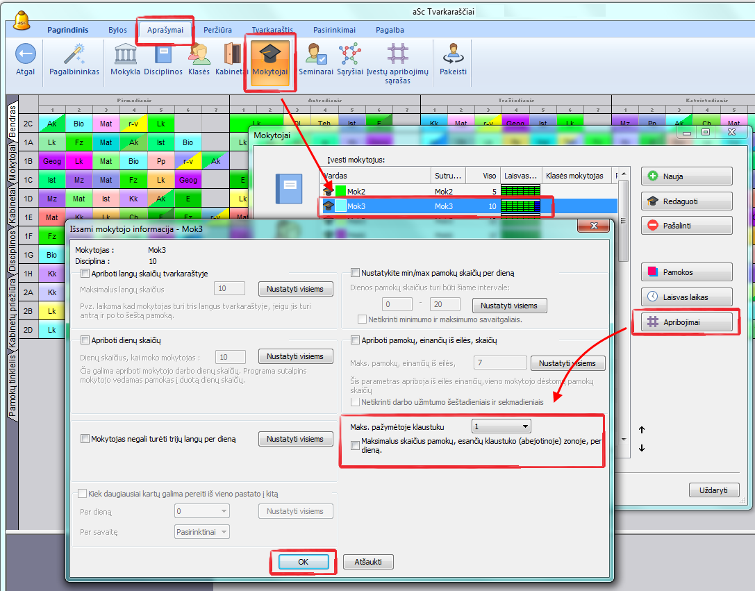 Pavyzdžiui, 5-ta, 6-ta ir 7-ta pamokos pažymėtos klaustuku, ir Jūs norite, kad mokytojas turėtų ne daugiau nei 2 pamokas tuo laiku kiekvieną dieną. Taip galėsite būti tikri, kad viena valanda liks pietų pertraukai.