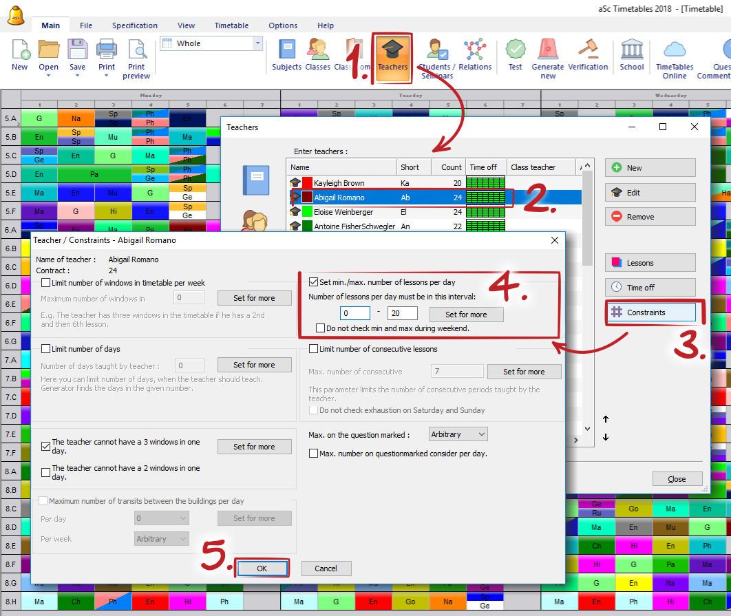 - please make sure that you do not require unrealistic demands here. It is strongly recommended to add this and similar requirements later. If it is not possible generate a timetable, it will be even more impossible to generate it with requirement that each teacher shall have 2-5 lessons each day. See: A good way to generate your timetable