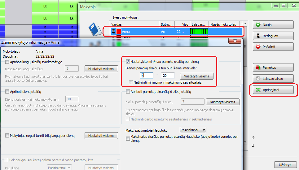 Minimalų ir maksimalų pamokų skaičių per dieną galima užduoti mokytojo apribojimų lange:
