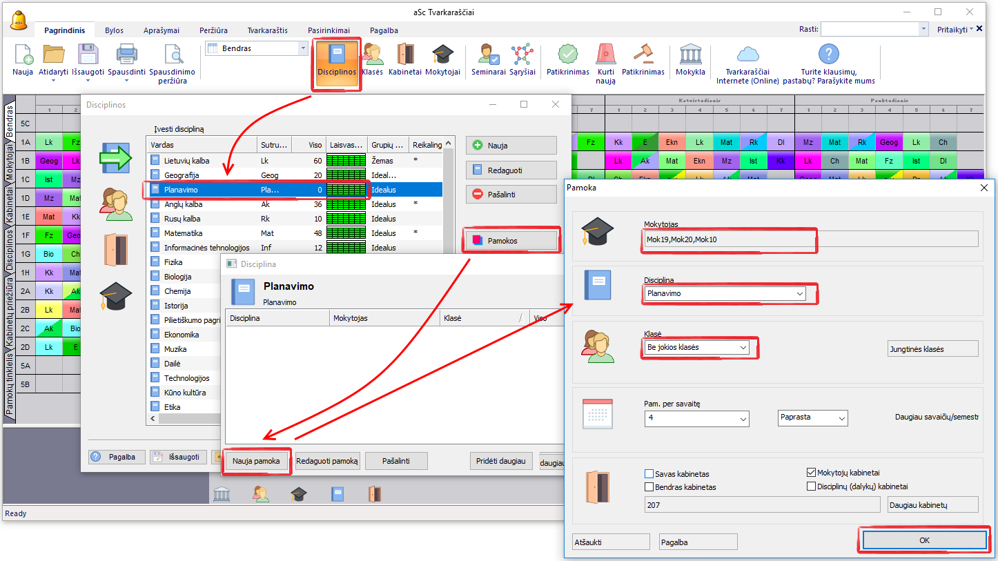 Planavimo (ar pesirengimo) pamoka gali būti įvesta kaip pamoka be klasės (pamoka, kuriai nepriskirta klasė). Tokios pamokos bus matyti mokytojo tvarkaraštyje, tačiau jų nebus klasės tvarkaraštyje.