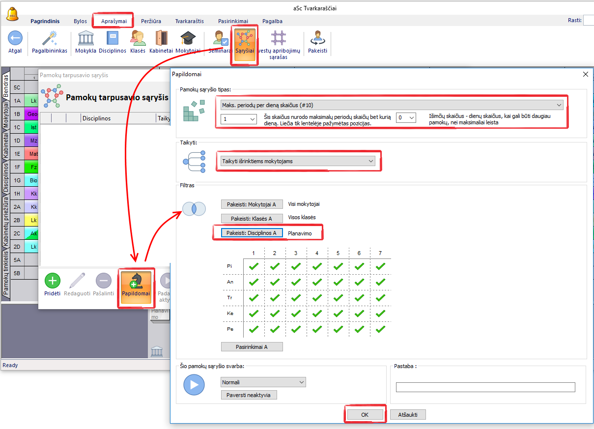 Naudodami papildomus pamokų sąryšius, jūs galite nurodyti, kad mokytojas gali turėti maksimum vieną tokią pamoką per dieną:
