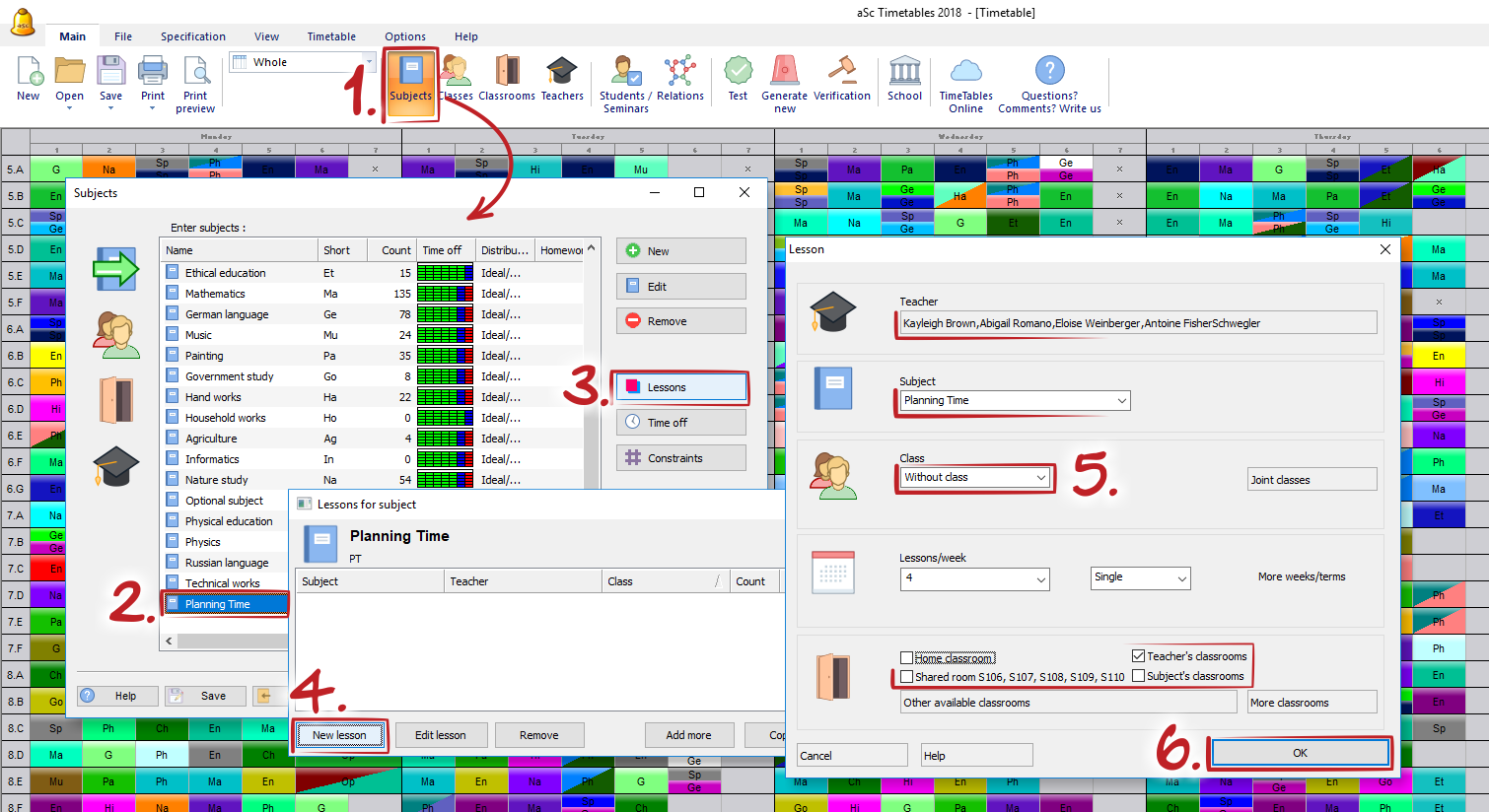 The planning time lessons can be inputted as lessons without class. They are shown in teacher's timetable and they are independent from any class.