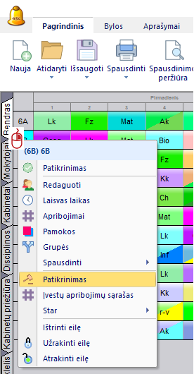 Jei norite pamatyti tik vienos klasės ar mokytojo tvarkaraščio problemas, galima dešiniuoju pelės mygtuku paspausti ant tos eilutės pavadinimo ir pasirinkti "Patikrinimas".