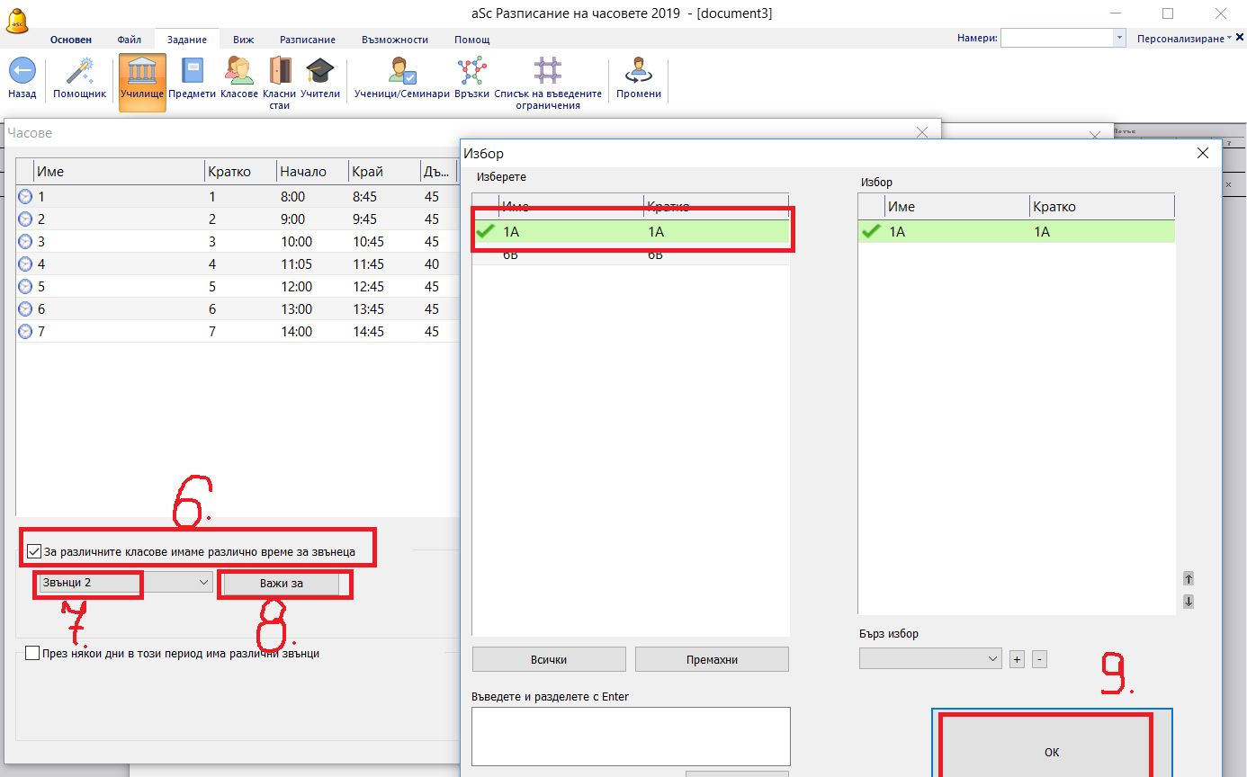 Като използвате менюто Училище и изберете бутон "Звънец/Преименувай часове" можете да създадете още звънци и да обозначите, че те са валидни за някои класове: