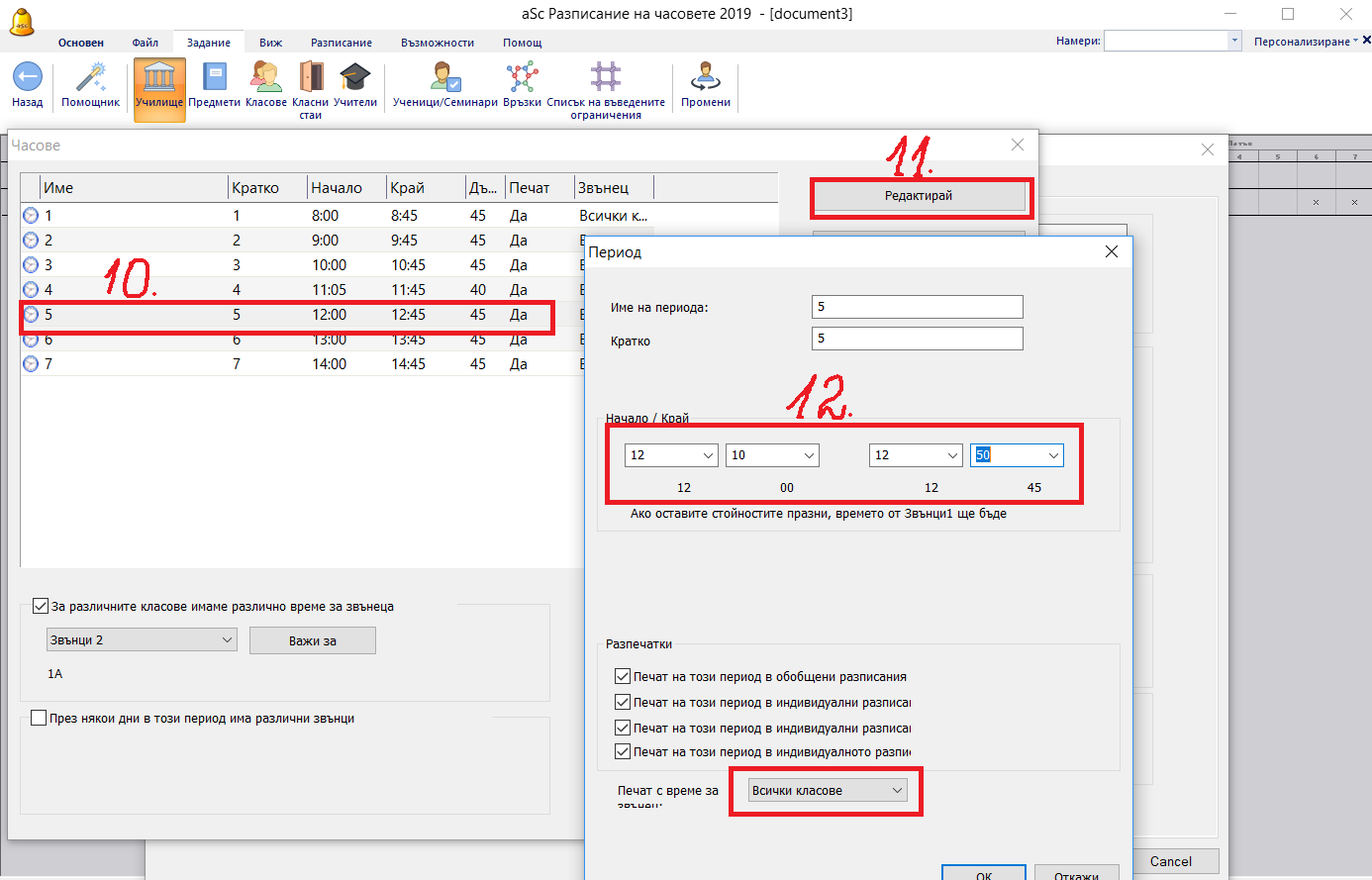 Забележка: Често срещана грешка е в падащото меню "Печат с време на звънец" да се прави промяна като се избере "Звънец 2". Не правете тази промяна, и оставете настройката за "Всички класове". В противен случай времето на часа ще излиза само в разпечатките за класовете, за които са избрани "Звънци 2".