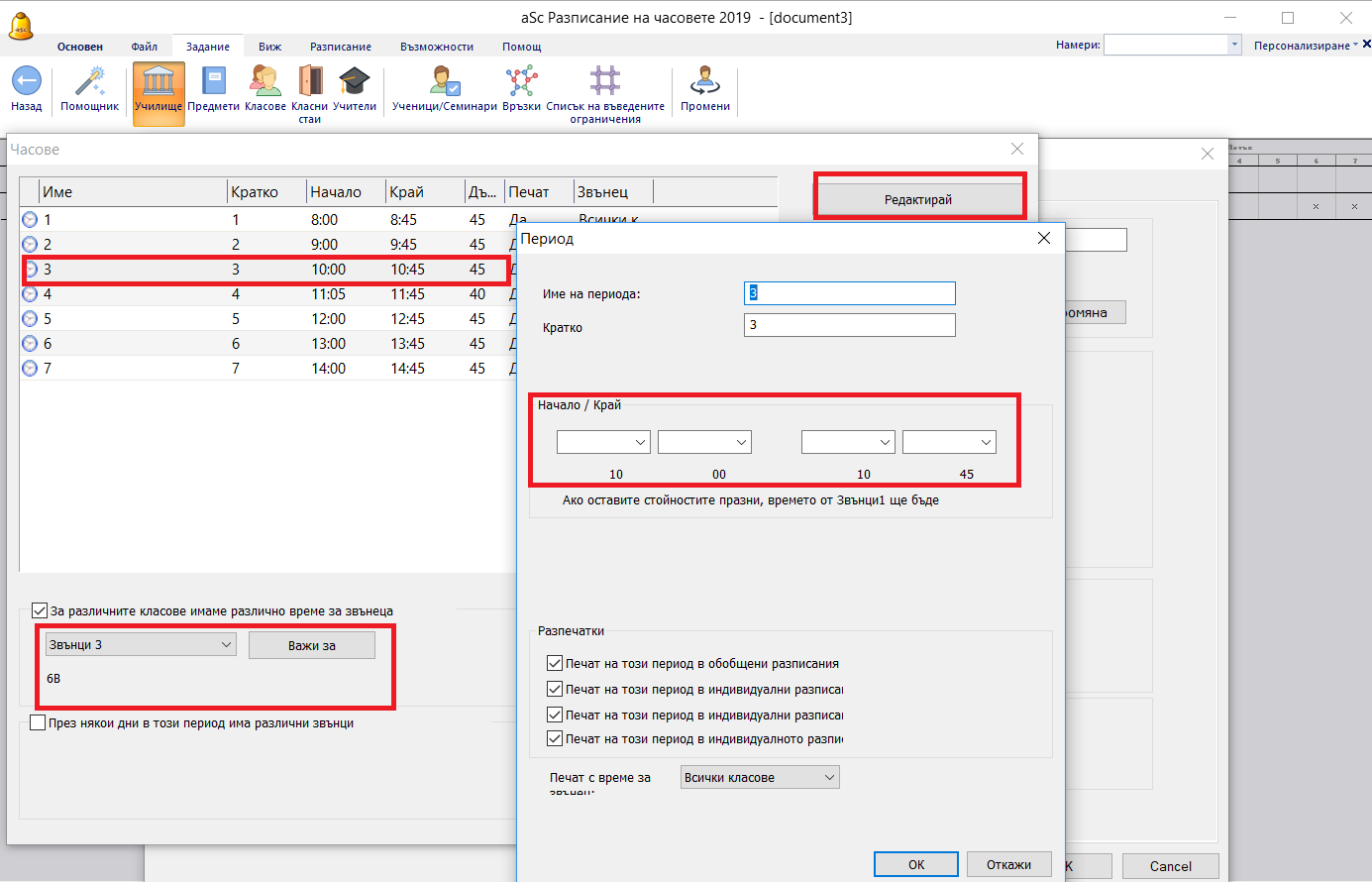 3. При така направената селекция на - "Звънци 2", просто променете времето за съответните различни часове. Изберете съответния час, кликнете на "Редактирай" и ги променете. Виждате отдолу настройките за "Звънци 1", така че трябва да настроите само там, където времето е различно.