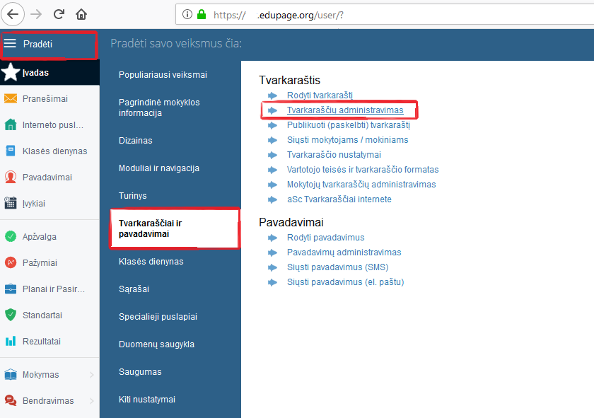 Prisijungę prie jos pasirinkite "Pradėti", "Tvarkaraščiai ir pavadavimai", "Tvarkaraščių administravimas".