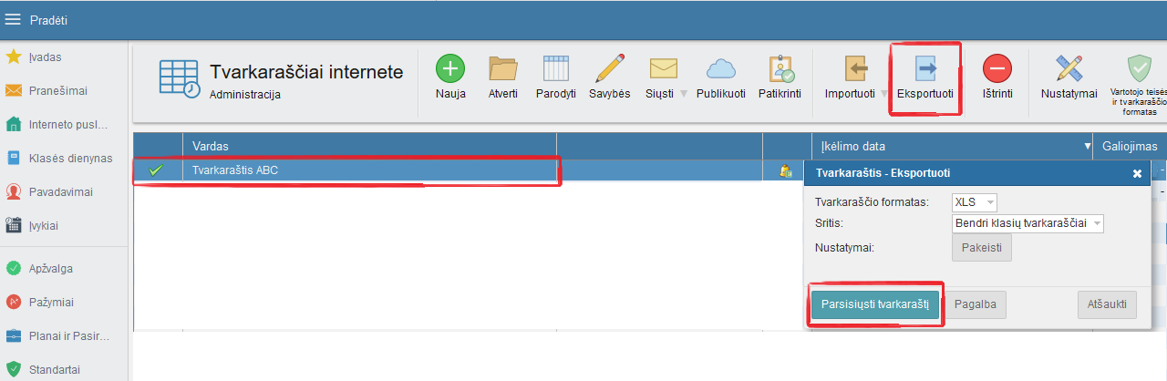 Prieš eksportuojant tvarkaraštį įsitikinkite, kad norimas tvarkaraštis yra įkeltas į "Tvarkaraščių Internete" svetainę.