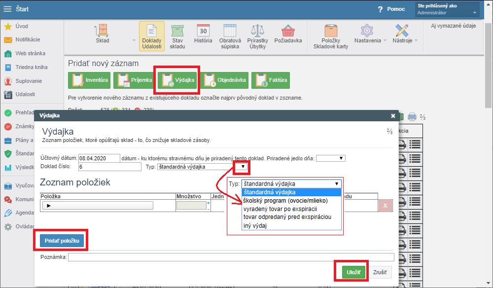 -> ak jedáleň v jeden deň aj varí aj vyraďuje zásoby po záruke, je potrebné zadať dve samostatné výdajky a s príslušným typom