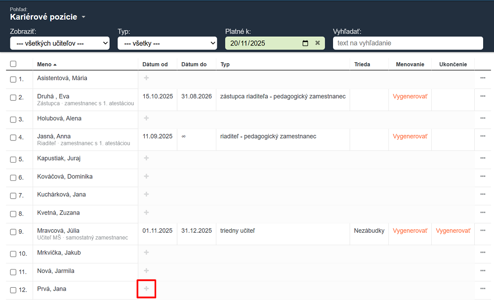 Pri zamestnancovi, ktorého chcete menovať do kariérovej pozície kliknite na "+"