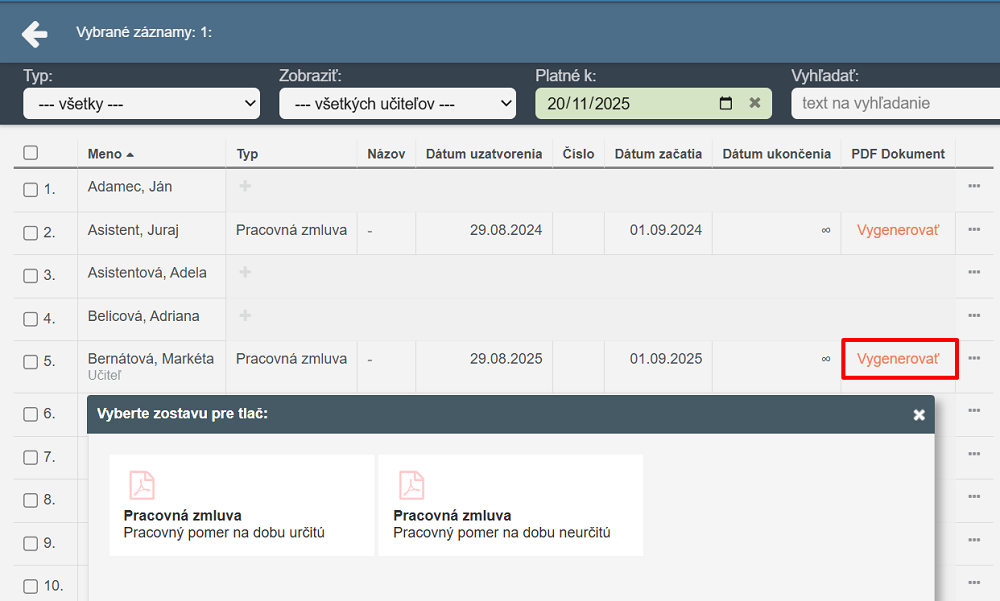 Pracovné zmluvy a dohody môžete vygenerovať cez Dokumentácia/Agenda zamestnancov.