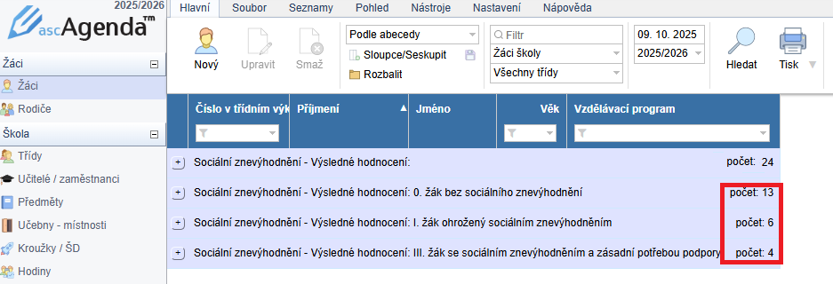 V Agende Online si potom môžete cez stĺpce/filtre zobraziť položku Sociální znevýhodnění - Výsledné hodnocení