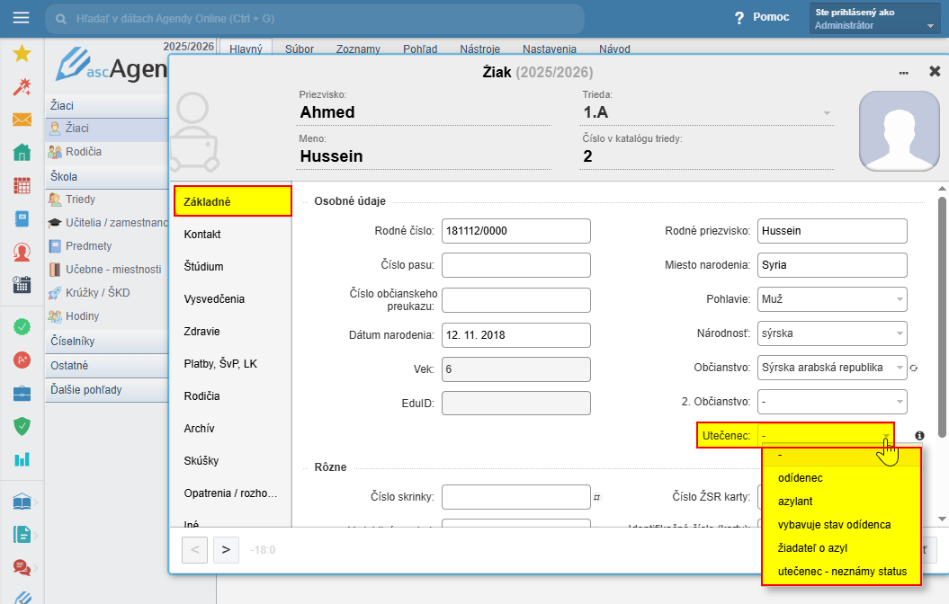 1. V karte žiaka v záložke Základné viete evidovať, či je daný žiak utečenec.