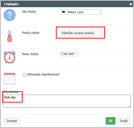 Ak si dané voľno čerpá zamestnanec počas roka, a je potrebné suplovanie, zaevidujeme si ho cez modul Suplovanie. Vyberieme buď typ "Dôležité osobné prekážky v práci a do poznámky, priamo v suplovacom okne, zapíšeme konkrétny typ, ktorý sa po vypublikovaní zobrazí aj v dochádzke.