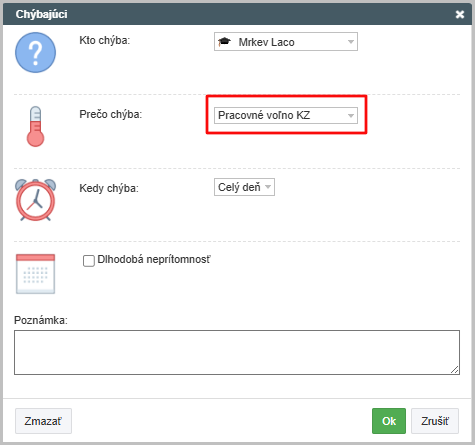 Ak je dané voľno čerpané počas napr. jesenných prázdnin, nie je potrebné suplovanie. Zapíše si buď učiteľ alebo mu zapíšeme daný typ na daný deň ručne do dochádzky pod vyššie spomínaný druh neprítomnosti a konkrétny typ zapíšeme do poznámky.