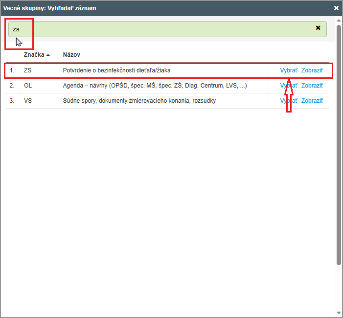 Poznámka: Žiadosti, ktorým nenastavíte vecnú skupinu, sa automaticky evidujú v osobných spisoch.