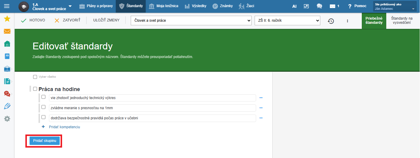 Novú skupinu štandardov pridáte tlačidlom Pridať skupinu.