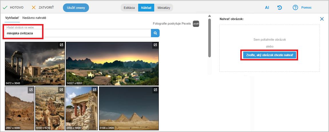 Ak máte vhodný obrázok k téme pripravený na svojom lokálnom počítači, zvoľte pravú možnosť. Ak obrázok nemáte, môžete použiť integrovaný vyhľadávač, ktorý je v ľavej časti obrazovky.
