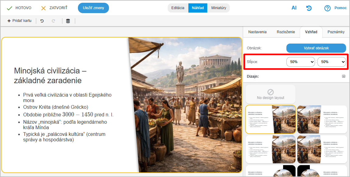 Ak chcete viete si nastaviť aj šírku stĺpcov, tj. akú veľkú časť slajdu zaberá obrázok a akú časť zaberá text.