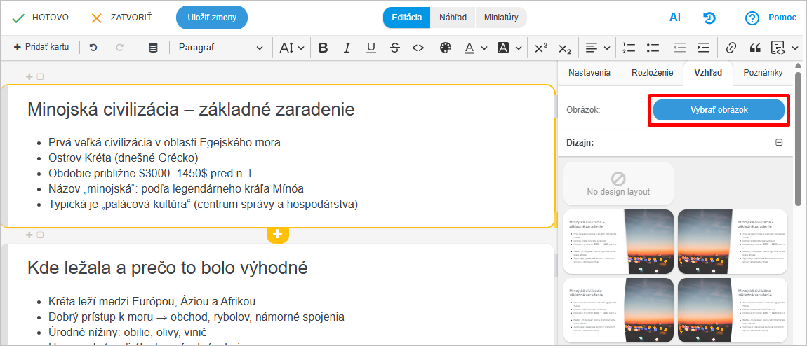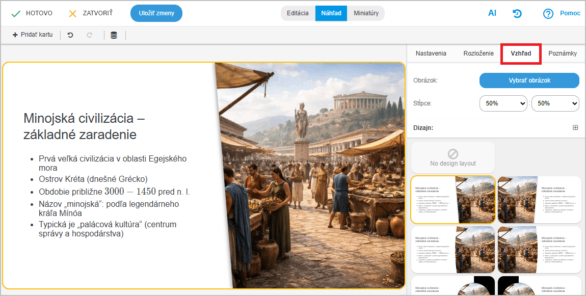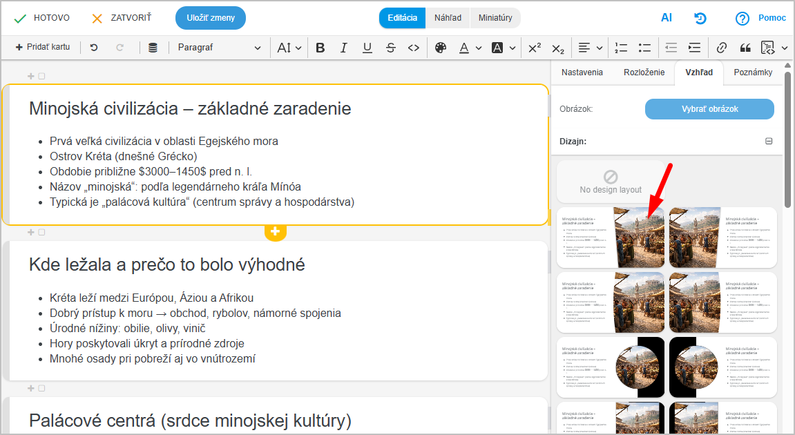 V pravej časti obrazovky vidíte náhľady, kliknutím vyberte želaný dizajn. Dizajn môžete hocikedy neskôr zmeniť. Výhodou EduPage je práve to, že má oddelený obsah slidu od dizajnu. Nemusíte obsah slidu meniť kvôli zmene dizajnu.