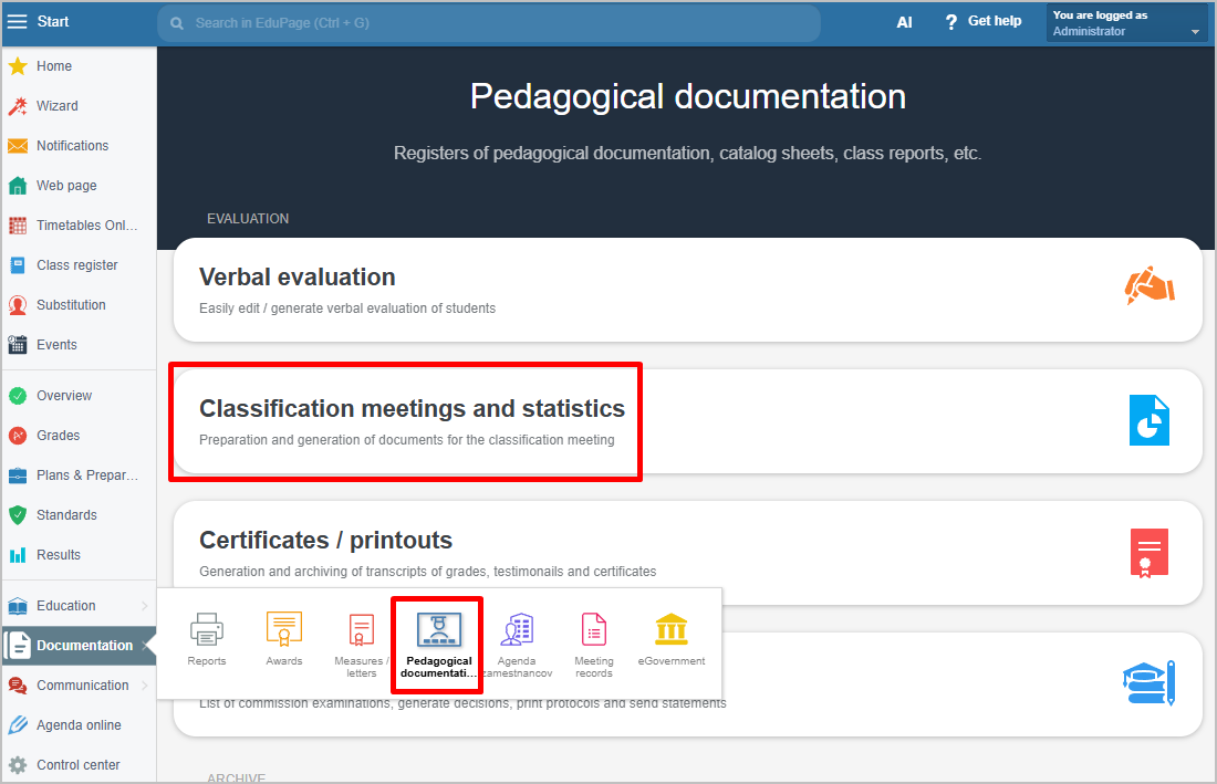 In the left menu, select Documentation / Pedagogical Documentation, then choose Classification meetings and statistics.