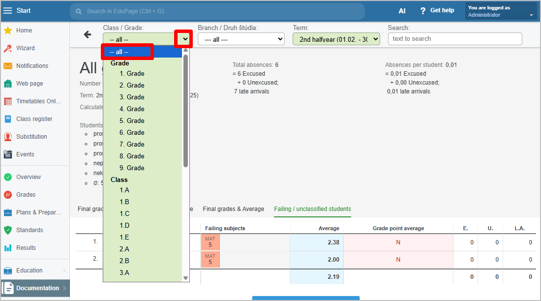 An overview of all failing and unclassified students across the entire school will be displayed.