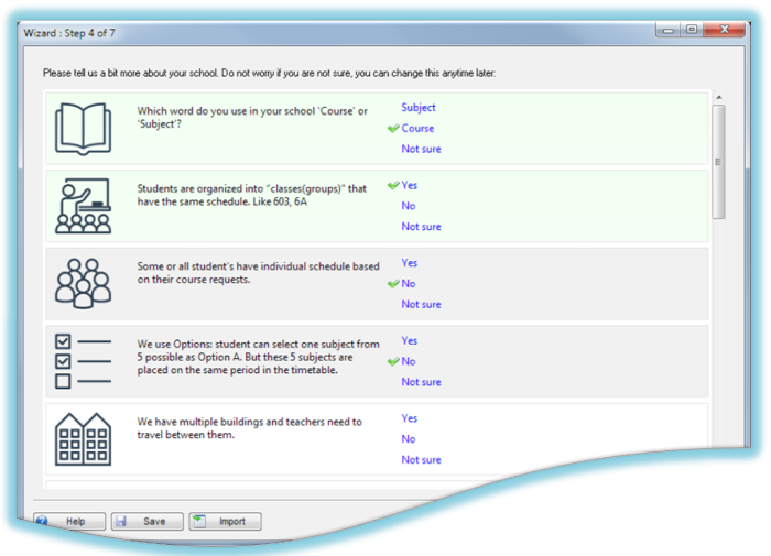 We have added new tabs to the initial wizard to help users setup their schedule. It asks some basic questions about your school, and will then customize the software options to better suit your school.