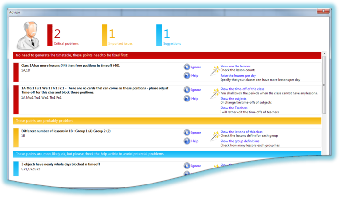 The new advisor will look at your timetable and list the issues we think that might help you move forward. The software will find and warn you about critical issues that need to be fixed before the generation. But the advisor will also display suggestions to avoid potential problems and to show you how to input certain situations.