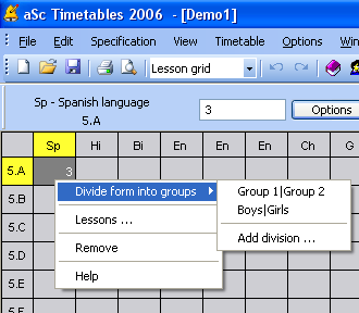 1. Select subject and class by clicking on the corresponding cell. Type 3 as count of lessons per week. Then press right mouse button on the created lesson and select the corresponding division: